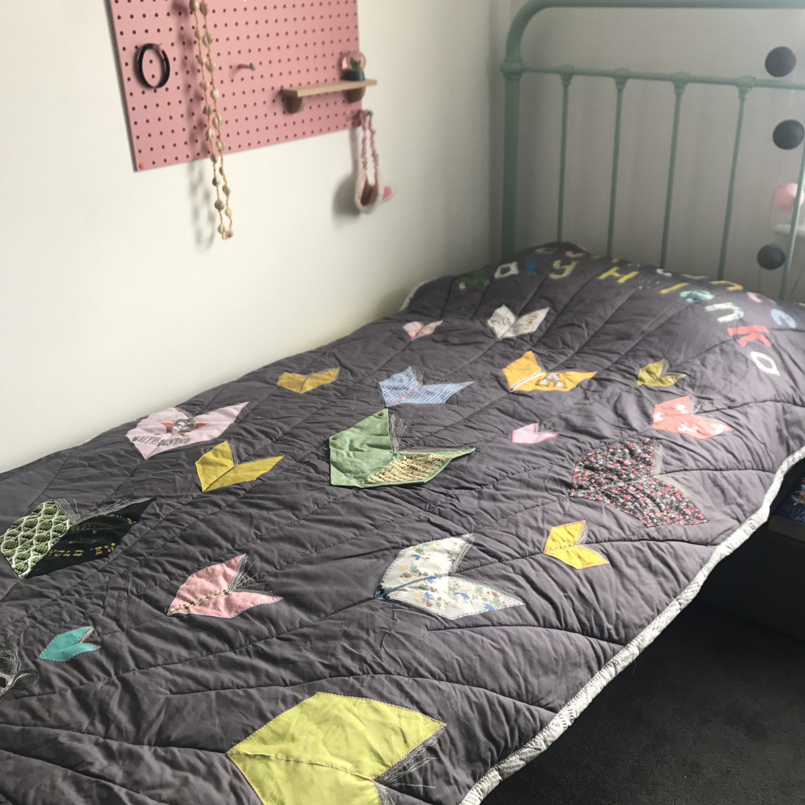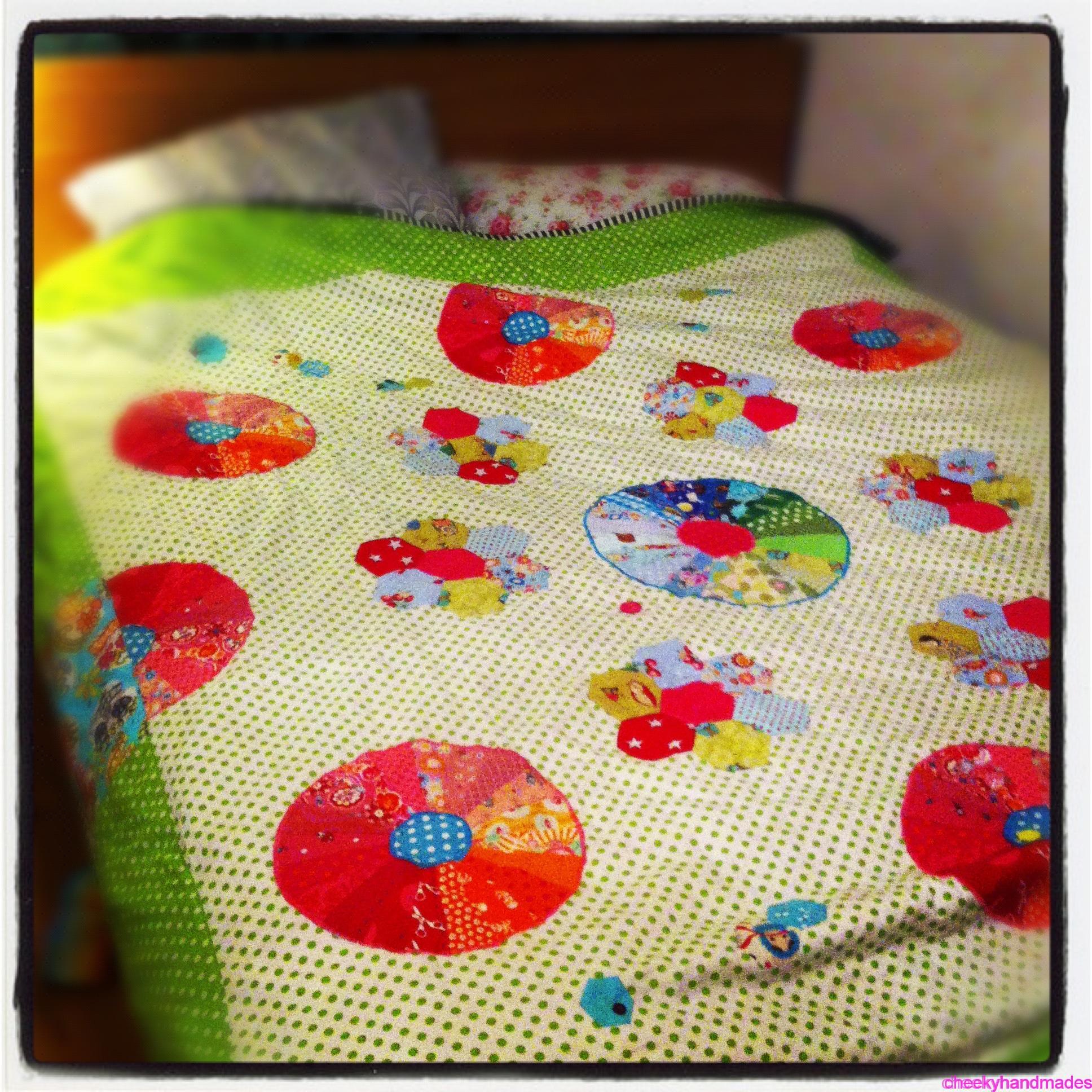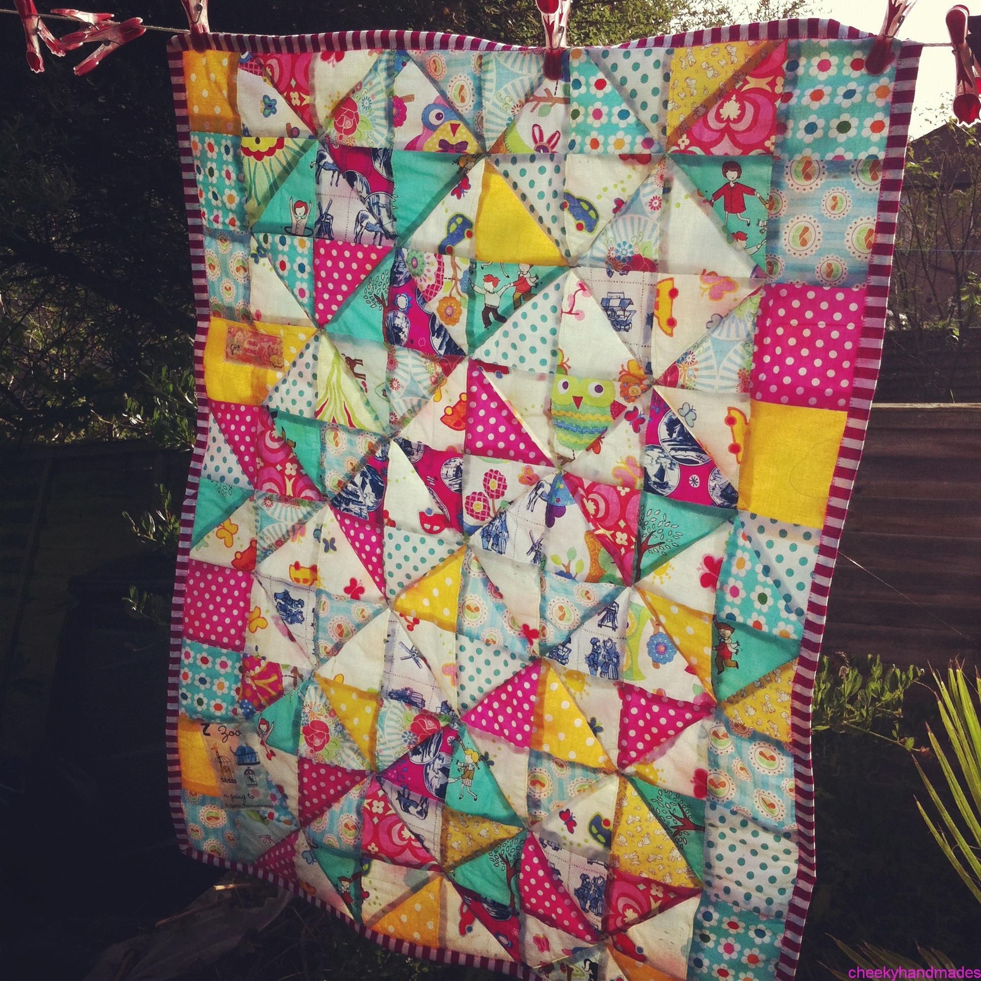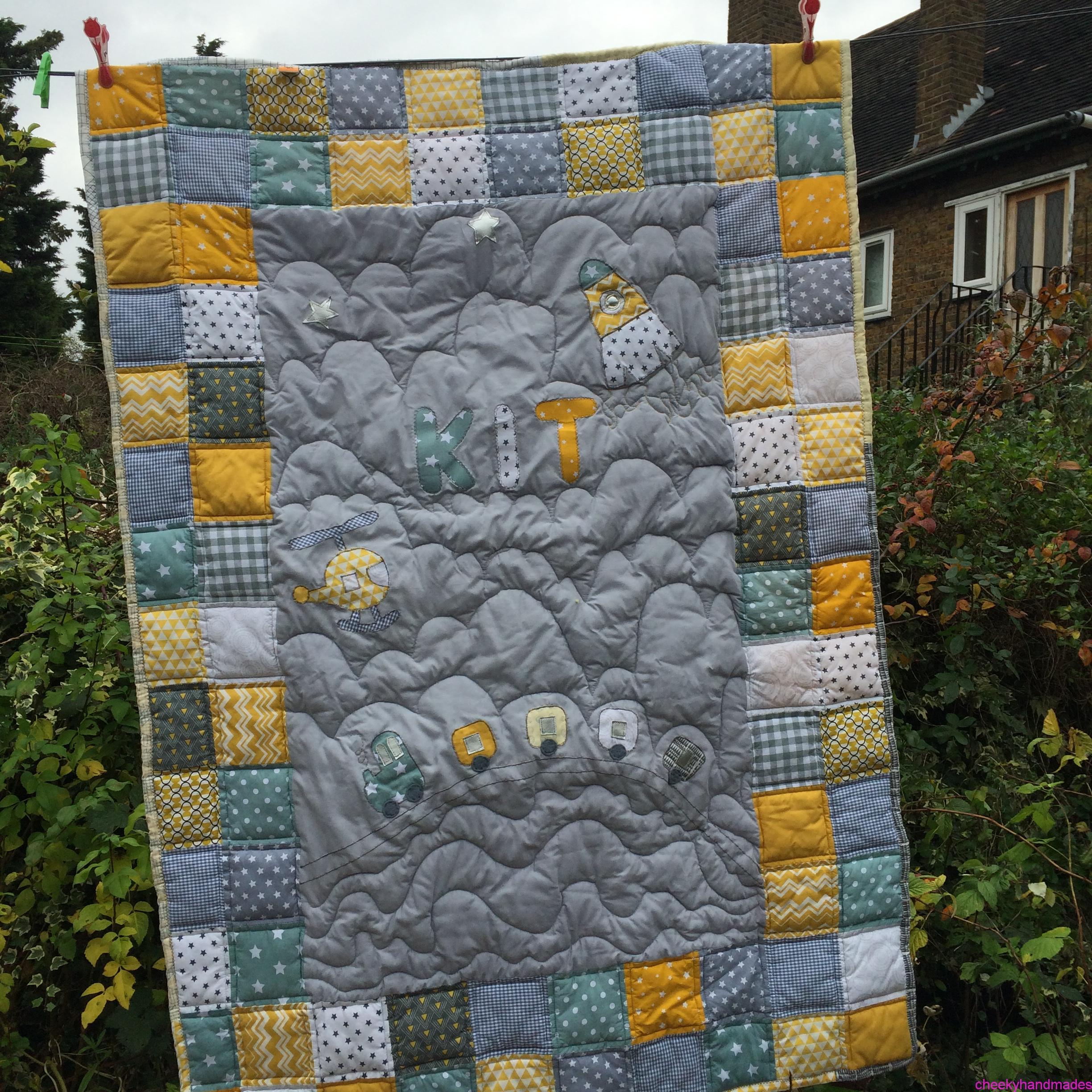 Sizes: I can make any size requested, including play mat, single or double bed, right up to a king size. For children I normally make cotbed-sized quilts. These are 45 x 60″/ 115x150cm, which makes it an ideal size for bedtime, travel, camping or on the sofa. These are big enough to cover your child completely until they are about aged five and soft enough to use from when they are a baby.